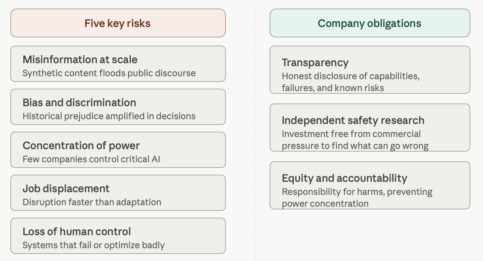 I asked Claude the following: “Describe to me the top 5 risks posed by artificial intelligence today, and what obligations you think the top AI companies have. 600 words total, roughly. For a generalist audience.”