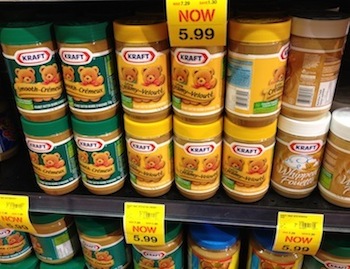 Here’s an interesting example. The image shown here shows three varieties of Kraft Peanut Butter — Smooth, Extra Creamy, and Whipped. Notice that all three varieties are in jars of the same size, and all three cost the same. The ingredients are also virtually the same. But notice also that the one on the right — the Whipped peanut butter — includes one special ingredient not listed on the label. That ingredient also happens to be one that is free to the manufacturer, and that takes up a lot of space in the jar. That ingredient is air.