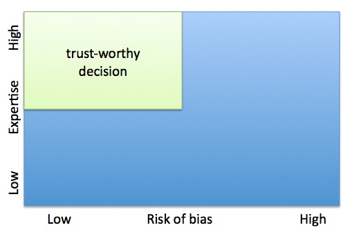 Consider this graphic, which illustrates the challenge of choosing experts to make decisions. On one hand, we want people with real expertise. On the other hand, we want to avoid conflict of interest. That is, we want maximum expertise and minimal risk of bias. So the upper-left quadrant of this graphic is the sweet spot: